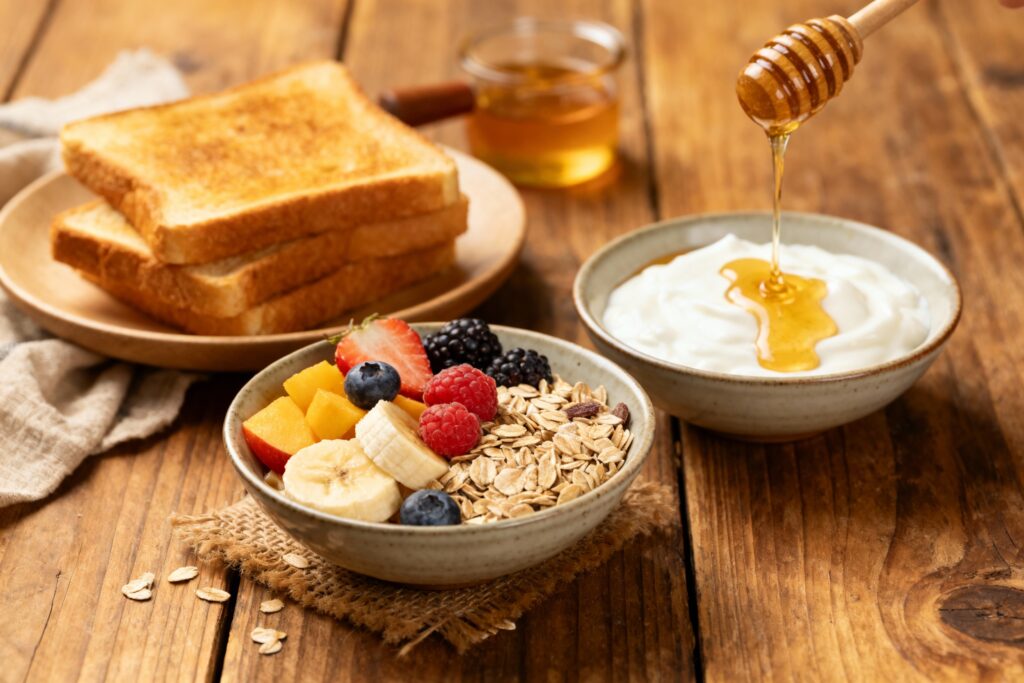 A drizzle of honey over whole-grain toast, a bowl of oats, cornflakes, yogurt, or muesli makes breakfast: